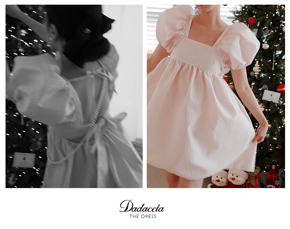 세실리에 반센의 로맨틱 무드가 듬뿍 들어간 핑크 틸드드레스입니다. 은은한 핑크컬러의 아름다운 텍스쳐로 착용하는 순간 얼굴을 더욱 화사히 밝혀주며 스퀘어 넥, 퍼프소매 디자인으로 체형을 여리여리하게 만들어줍니다. 백사이드 리본 포인트로 촬영에 특별한 포인트로 사용해보세요.